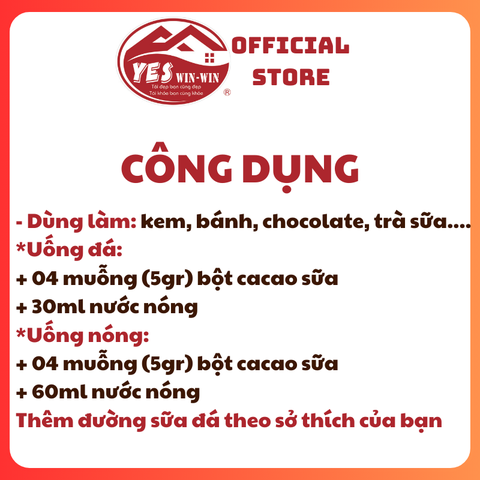 - BỘT CACAO sữa tiện lợi được làm từ hạt cacao lên men tốt nhất, pha trộn với đường tinh luyện và sữa bột Hà Lan. Với công thức mix giữa với đường và bột sữa tiện lợi, đảm bảo tỷ lệ bột cacao phù hợp nhất để bạn có thể thưởng thức trọn vẹn một tách ca cao nóng thơm ngon. Bạn chỉ việc khuấy trực tiếp Bột Cacao 3in1 với nước nóng là có thể sử dụng ngay. Rất đơn giản và tiện dụng nhưng vẫn đảm bảo hương thơm ngây ngất từ cacao. Một số nhà hàng, quán cafe mới mở, pha chế non tay hoặc muốn tiết kiệm thời gian phục vụ rất ưa thích sản phẩm này của chúng tôi bởi chỉ cần cho lượng cacao 3in1 như nhau thì sẽ giúp cho tách cacao phục vụ khách hàng có chất lượng như nhau.
